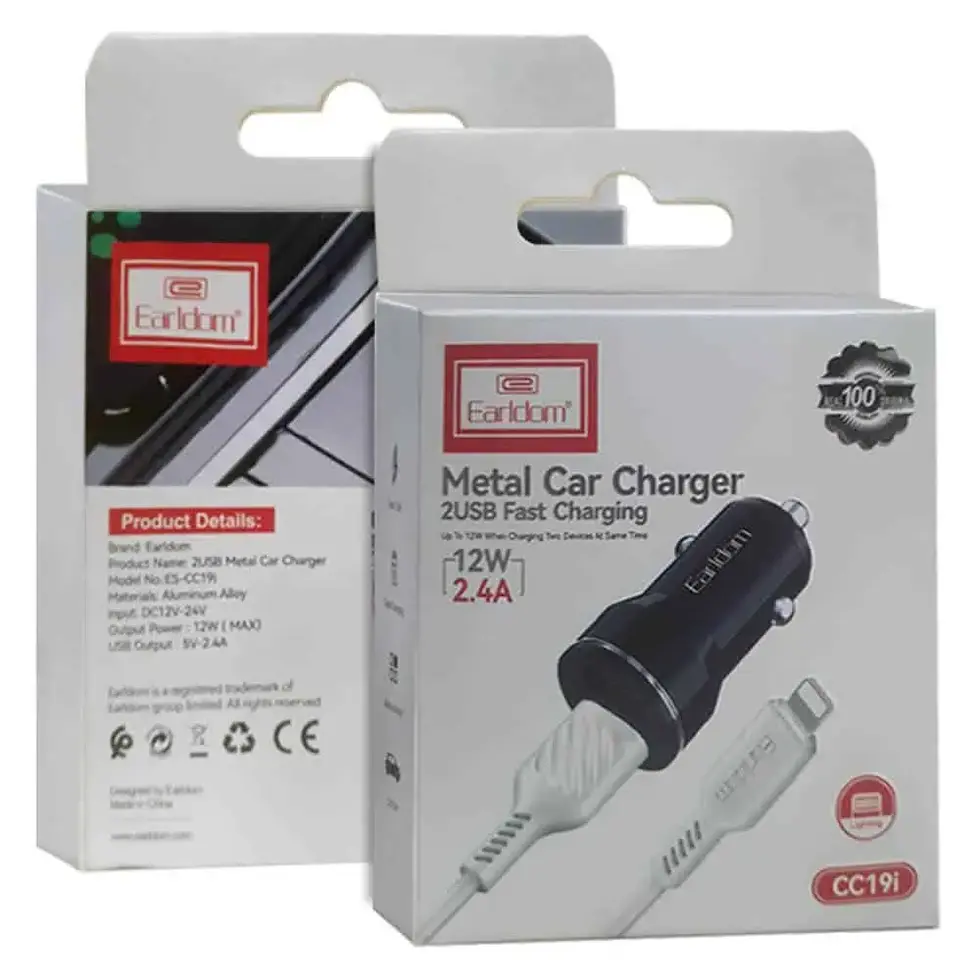 Introducing the Earldom Branded 2 USB 12W 2.4A Metal Fast Car Charger with USB A to Lightning Cable – the ultimate solution for keeping your devices powered up while on the go. This premium car charger ensures that your gadgets are always ready, delivering high-speed charging in a sleek and durable package.